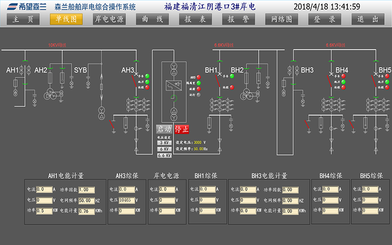 電氣主接線圖:以移屏和分幅顯示方式顯示岸電系統(tǒng)電氣主接線圖,并表示出運(yùn)行狀態(tài)。測(cè)量參數(shù):P、Q、COSφ、V、A、F。以移屏和分幅顯示方式顯示岸電電源的直流系統(tǒng)、站用電接線圖。運(yùn)行人員或工程師以在線鍵盤輸入的交互方式可編輯各設(shè)備的運(yùn)行、測(cè)試、接地、鎖定等工況報(bào)告,對(duì)這些報(bào)告可以進(jìn)行修改、檢索、顯示、打印。