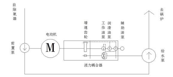 系統(tǒng)由前置泵、電動機、液力偶合器(包含工作油路、潤滑油路部分)、給水泵組成,系統(tǒng)根據(jù)機組負荷變化,通過液力偶合器調(diào)節(jié)給水泵供水量的大小,以滿足鍋爐生產(chǎn)系統(tǒng)供水量的需要。