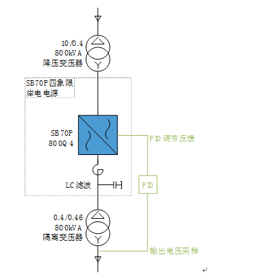 岸電系統(tǒng)在輸出隔離變壓器后端設(shè)置了輸出電壓采樣點(diǎn),該點(diǎn)采樣得到實(shí)時(shí)輸出電壓值后將數(shù)據(jù)送往系統(tǒng)內(nèi)部PID機(jī)構(gòu)進(jìn)行對(duì)比,將結(jié)果轉(zhuǎn)換為控制指令后送往岸電系統(tǒng)。岸電系統(tǒng)對(duì)輸出電壓進(jìn)行調(diào)節(jié),最終輸出電壓達(dá)到預(yù)期輸出值,岸船連接段系統(tǒng)壓降問(wèn)題被解決。