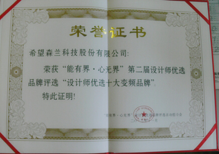 2012年11月30日,在北京舉行的第二屆設(shè)計(jì)師優(yōu)選品牌評(píng)選活動(dòng)上,森蘭變頻器憑借過硬的產(chǎn)品質(zhì)量和良好的市場口碑,榮獲““設(shè)計(jì)師優(yōu)選十大變頻品牌”的稱號(hào)。